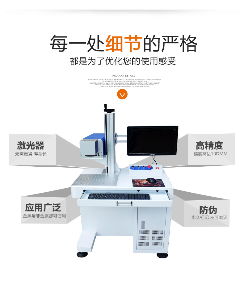 光纤激光打标机采用光纤激光器,振镜扫描系统,输出功率稳定,光学模式好,光束质量优异、打标速度快,效果好,效率高,能充分满足客户大批量生产需求。